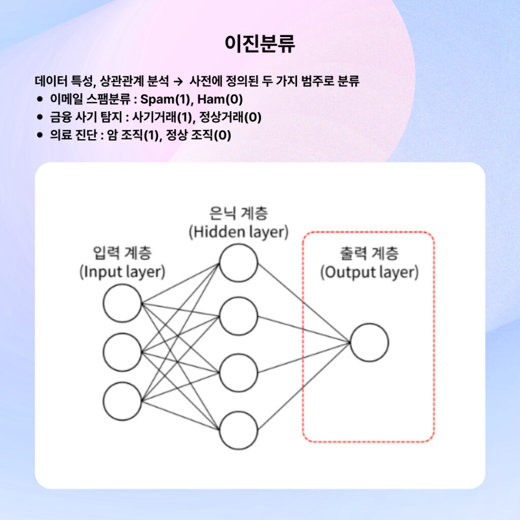 개념 두 가지 범주 중 하나를 선택하는 문제입니다. Yes or No, 0 or 1과 같이 두 가지 경우의 수만 존재합니다.