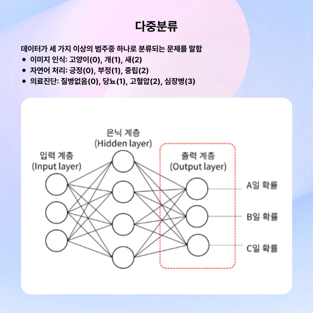 다중 분류에서는 모든 클래스에 대한 확률을 계산하고, 가장 높은 확률을 가진 클래스를 최종 결과로 선택합니다. 모든 확률의 합은 100%가 됩니다.