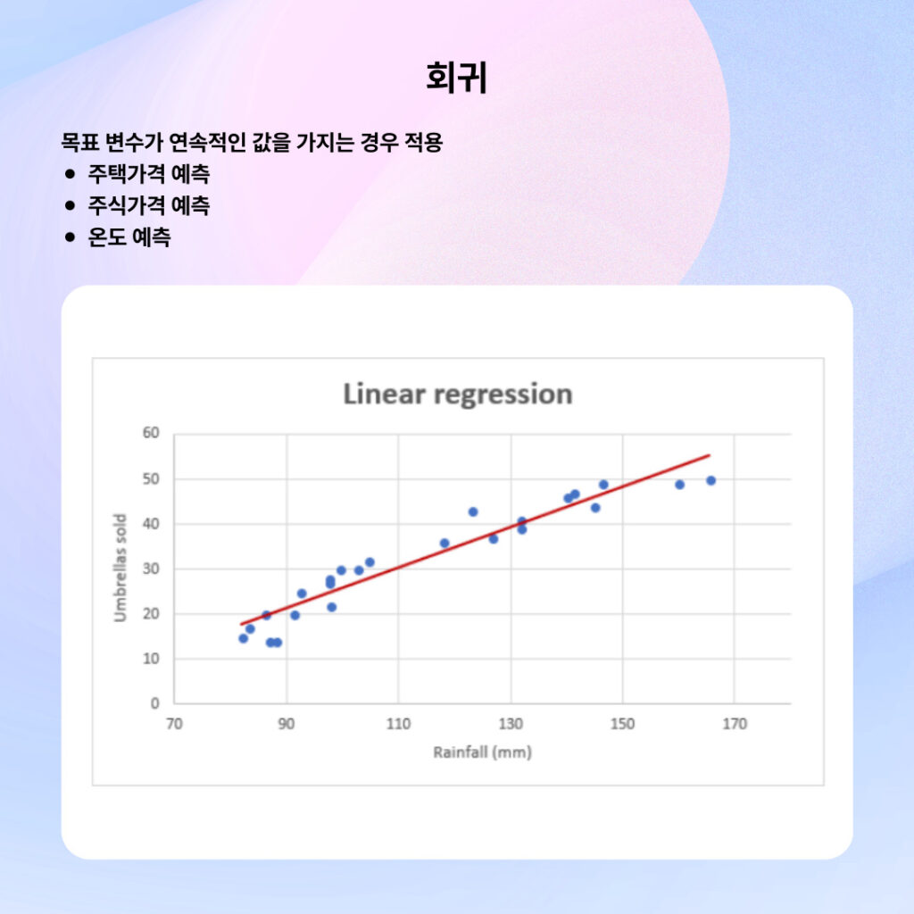 회귀는 연속적인 숫자 값을 예측하는 문제입니다. “얼마나”, “몇 개”, “어느 정도”처럼 구체적인 수치를 알고 싶을 때 사용합니다.
