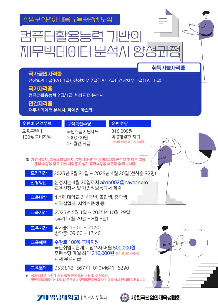 #영남대학교 #회계세무학과 #국비지원교육 #컴퓨터활용능력 #전산세무회계 #빅데이터분석사 #파이썬 #취업준비 #자격증취득 #무료교육 #훈련수당 #구직촉진수당